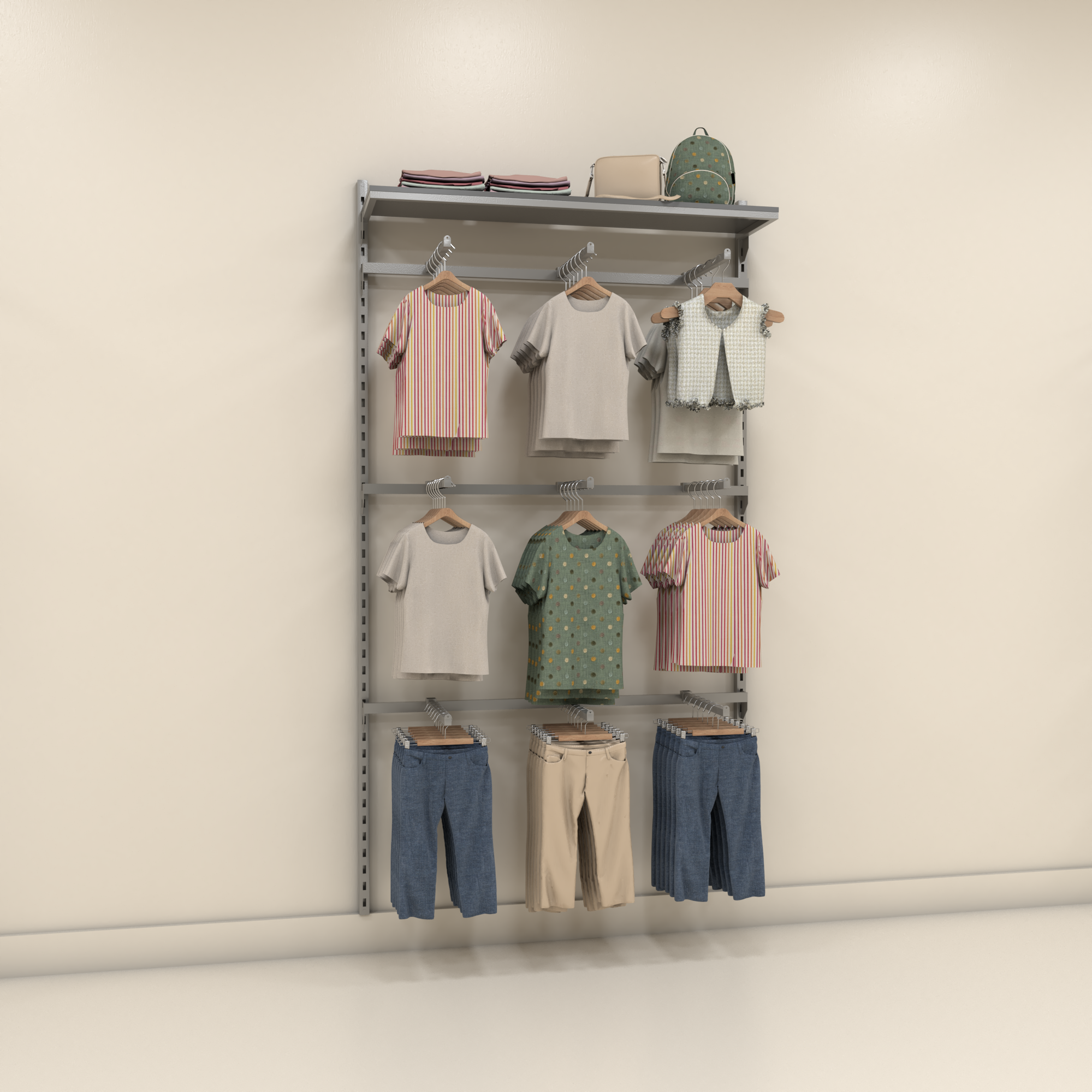 Organize e transforme o espaço da sua loja com o Conjunto TM, um sistema de parede completo da linha MetalonPremium. Projetado com colunas de cremalheira ajustáveis, ele reúne em uma única estrutura tudo o que você precisa para expor roupas penduradas, acessórios, calçados e itens dobrados — do teto ao chão, aproveitando cada centímetro da parede.