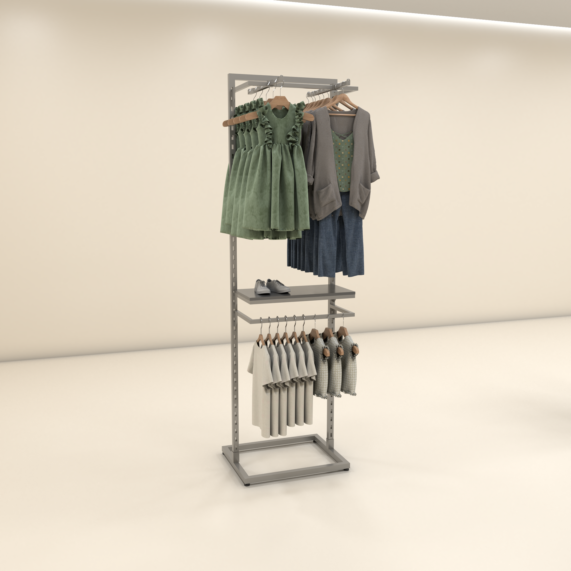 A configuração com dois níveis de cabideiros e uma prateleira MDF permite expor blusas e camisetas na parte superior, calças ou saias na inferior, e acessórios na prateleira. Funciona perfeitamente em lojas de moda feminina, masculina e infantil, boutiques, brechós, lojas multimarcas e qualquer ponto de venda que precise de exposição vertical compacta. Combine várias torres BR 20 lado a lado para criar um módulo contínuo de parede.