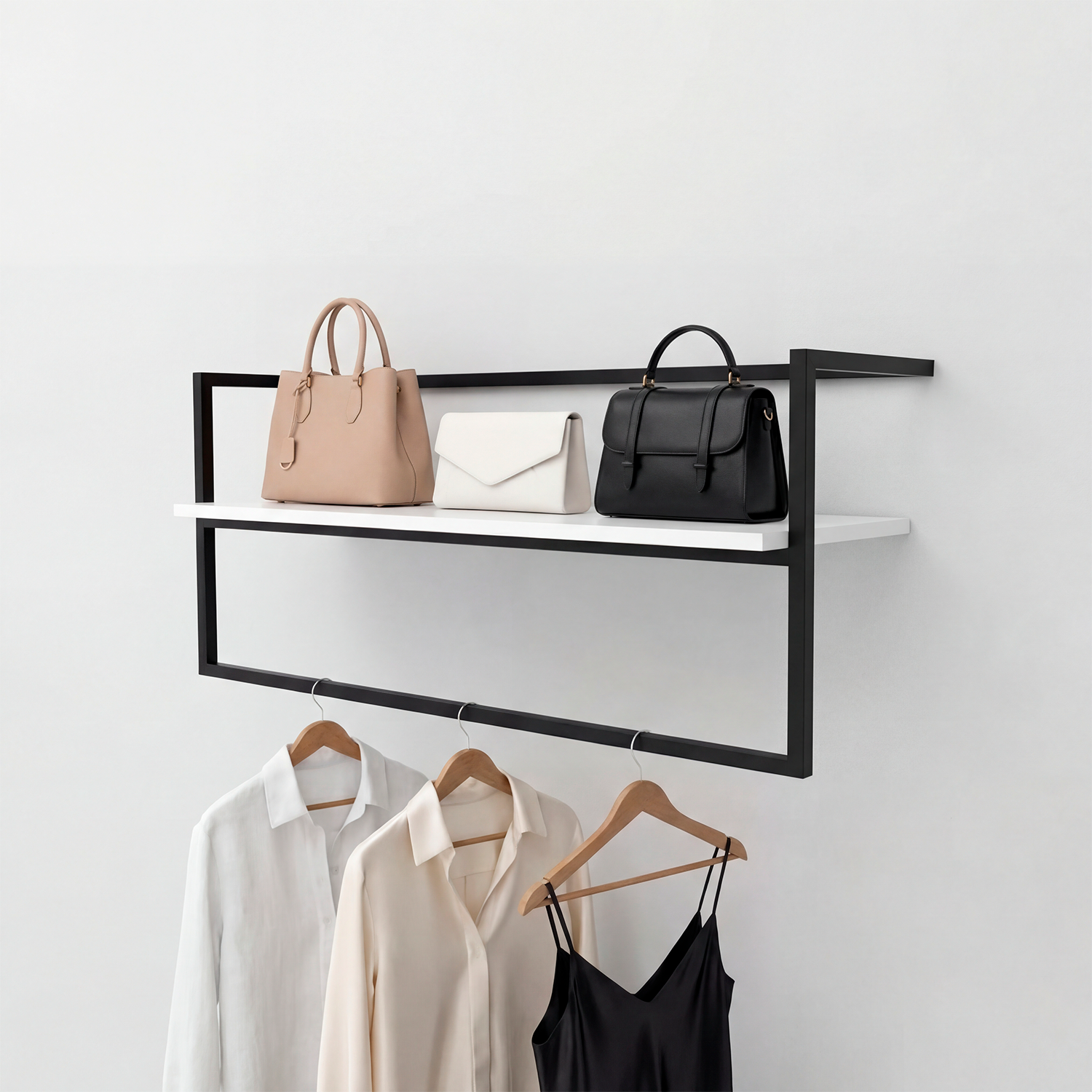Arara comercial de parede, com cabideiro e prateleira, ideal para lojas de roupas e acessórios, sendo perfeita para a exposição de vestidos, camisetas, casacos e bolsas.