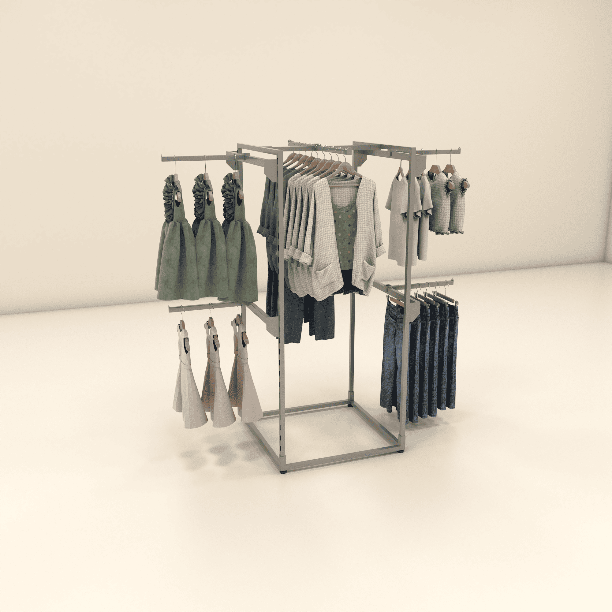 Organize o centro da sua loja com a Arara de Chão Magazine AR 30, um conjunto modular que permite expor roupas em cabides nos quatro lados simultaneamente. Com estrutura compacta de 62x62cm de base e 140cm de altura, a arara ocupa pouco espaço no piso e oferece alta capacidade de exposição — perfeita para criar uma ilha de destaque com peças variadas no coração do seu ponto de venda.
