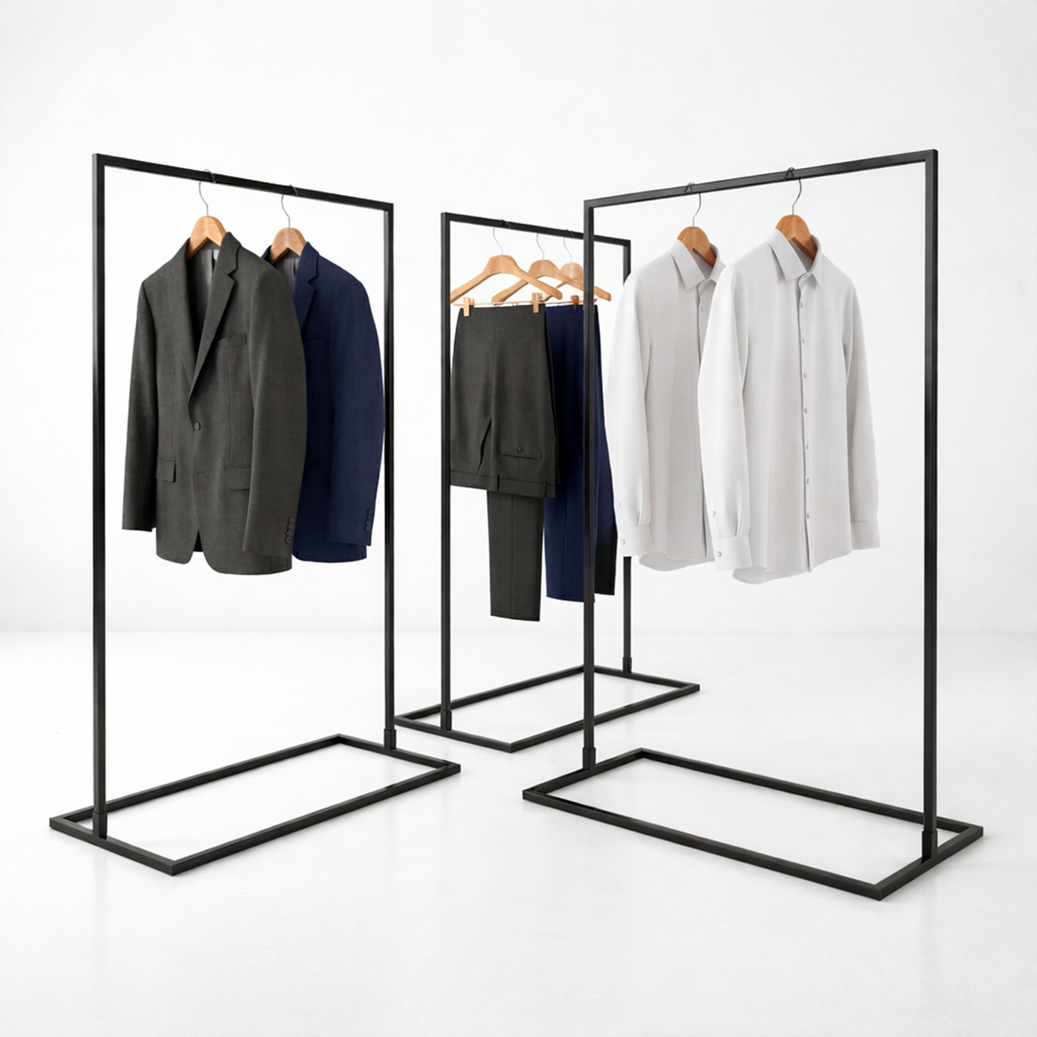 - Kit Completo: o conjunto inclui 3 araras, perfeitas para compor diferentes setores da loja ou criar um layout que permita maior fluidez e organização no ambiente. As araras podem ser posicionadas conforme a necessidade, facilitando o acesso e visualização das peças.
