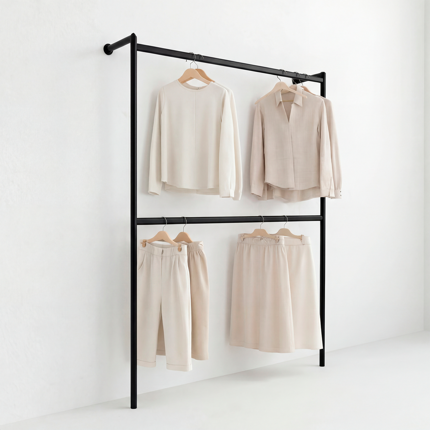 A Arara Tiger H é a solução perfeita para quem busca robustez, estilo e praticidade na organização de roupas em lojas ou ambientes comerciais. Ideal para exposição de peças como vestidos, casacos e camisas, esta arara de parede oferece um design moderno e elegante, aliado à durabilidade e resistência, características dos produtos Metalon Premium.