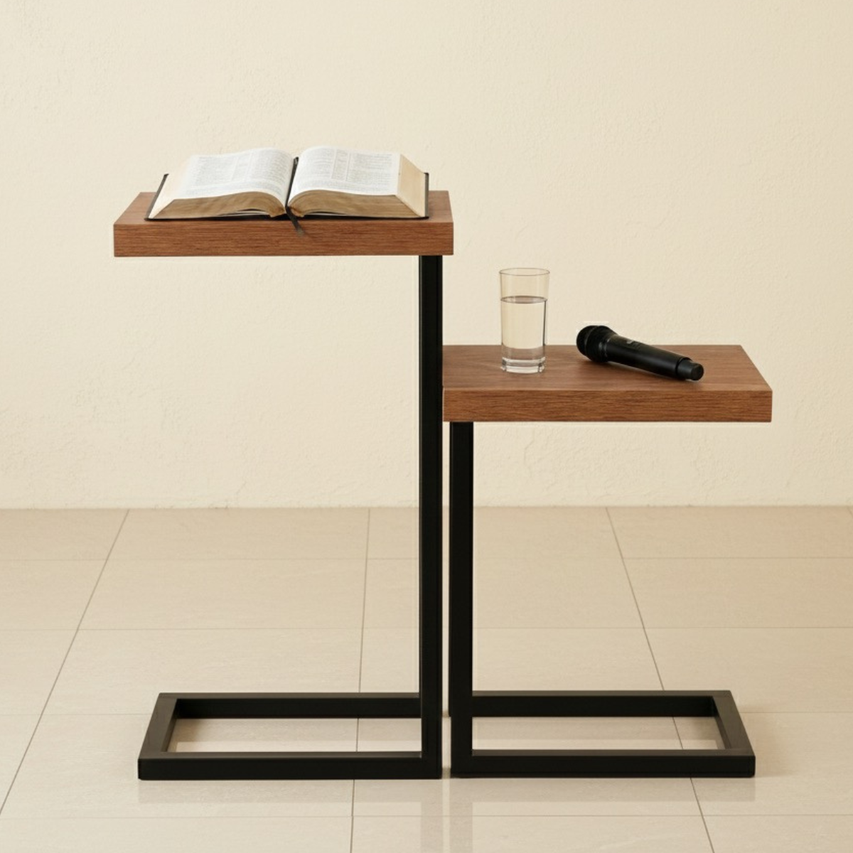 Conjunto Púlpito com Mesinha em aço carbono (metalon 40x40), ideal para igrejas e eventos. Design moderno, durável e elegante com tampo de MDF engrossado.