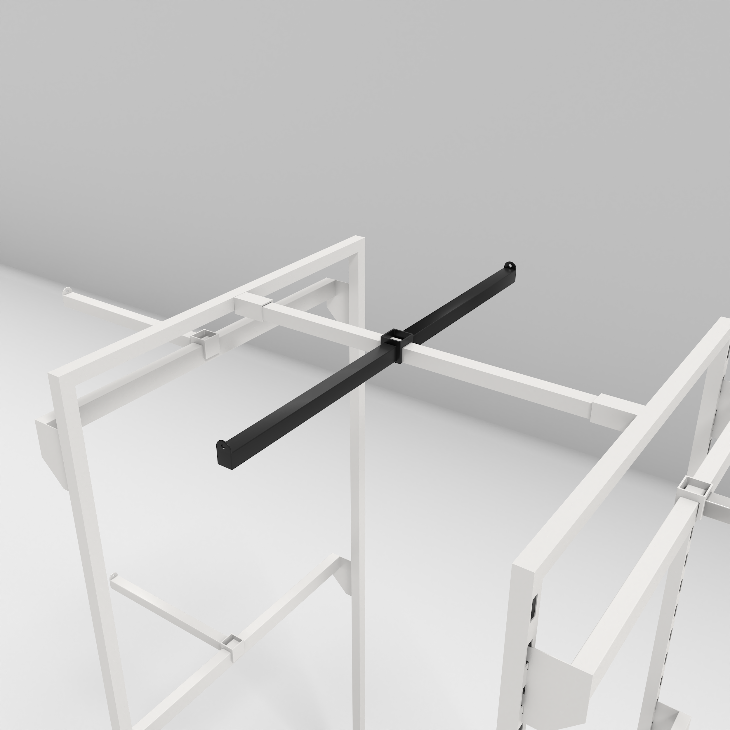 É ideal para lojas de moda feminina, masculina, infantil, fitness, moda íntima, multimarcas e brechós que utilizam sistemas modulares com colunas centrais. Também funciona bem em showrooms e ateliês onde a cremalheira divide ambientes ou cria corredores de exposição. Por ser compacta (30cm de cada lado), não invade o espaço de circulação — perfeita para layouts que precisam de exposição em profundidade sem ocupar muita largura.
